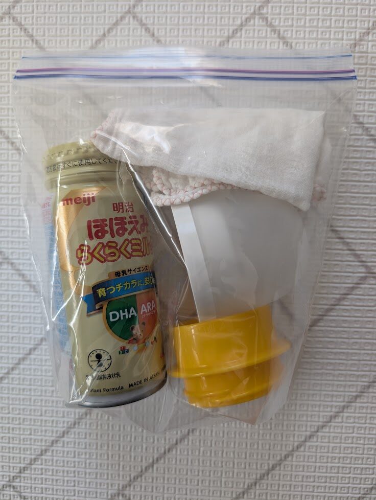 ミルク缶は空港や観光地で使います。こんな感じでセットしておくと楽です。ガーゼも一緒にいれてます。