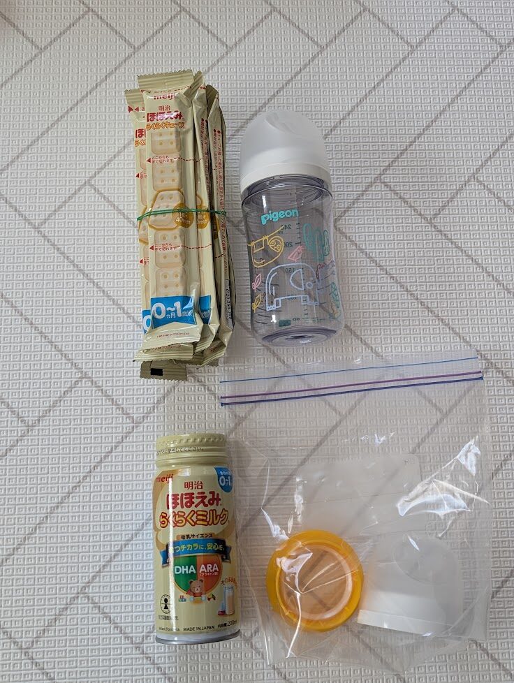 哺乳瓶は2個持って行こうと思っていましたが忘れて1個になりました。しかし意外と上手いこと使えました。1個しかないので「使ったらすぐ洗って消毒!」を私も夫も徹底できたので、逆に良かったです。私たちの性格上、2個あると「あとでまとめてやろう…」で大変なことになっていたはずです。笑