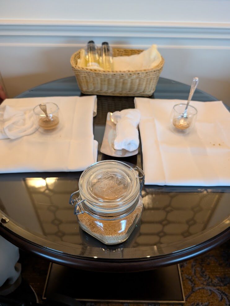 高級スパブランドのオイルと砂糖をブレンドしたオリジナルのハンドスクラブを作ります。実際にエステサロンで使用しているオイルだそうです。作ったものは丁寧に包んでいただき持ち帰ることができました。