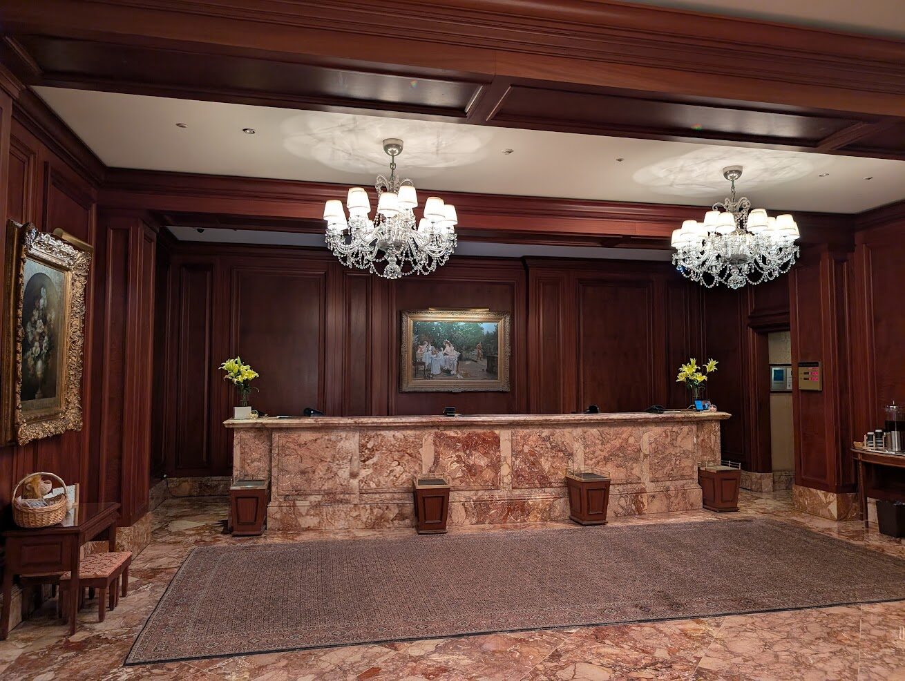 フロントと大きなシャンデリア。この絵がいちばん高価?だったかな。